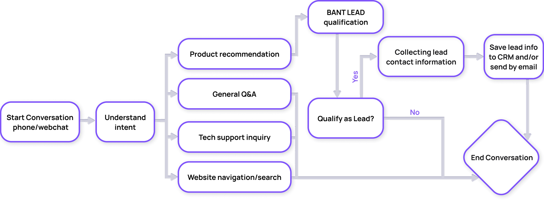 Engages in company-related products and services conversation, identifying user intent, saving qualified leads into CRM, and scheduling calls with human sales reps.